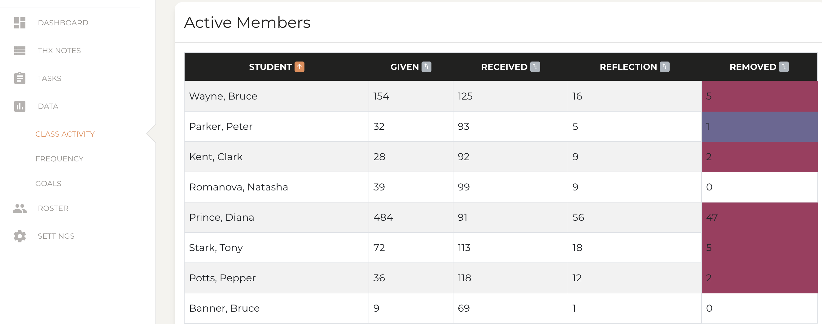 Clicking 'Frequency' provides a bar graph view of thx note frequency per student.